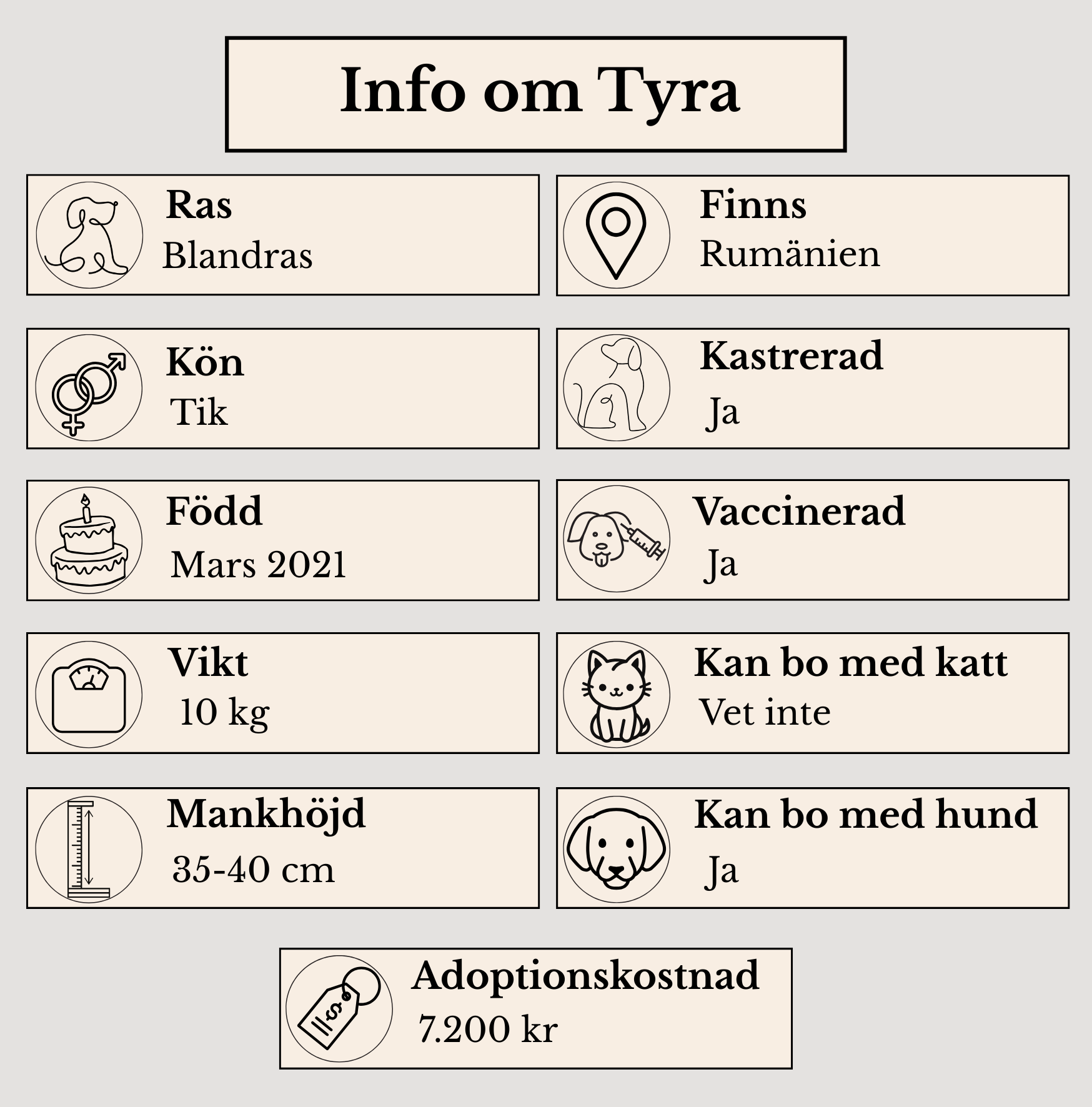 Vi söker en van familj till Tyra som har tålamod och tid att låta henne utvecklas i takt hon känner sig bekväm i. Det är viktigt att se storheten i varje steg, det är en seger att vinna Tyras tillit. Hon väntar på att en familj ska visa henne vägen i livet och att världen är full av fina saker att uppleva. Tyra önskar få gå långa promenader, i sköna miljöer. Njuta av att ströva fritt i rastgården och i slutet av dagen vila mjukt i närvaron av sin familj. Hon trivs väl med andra hundar och kan gärna både bo i sällskap och som ensamhund.