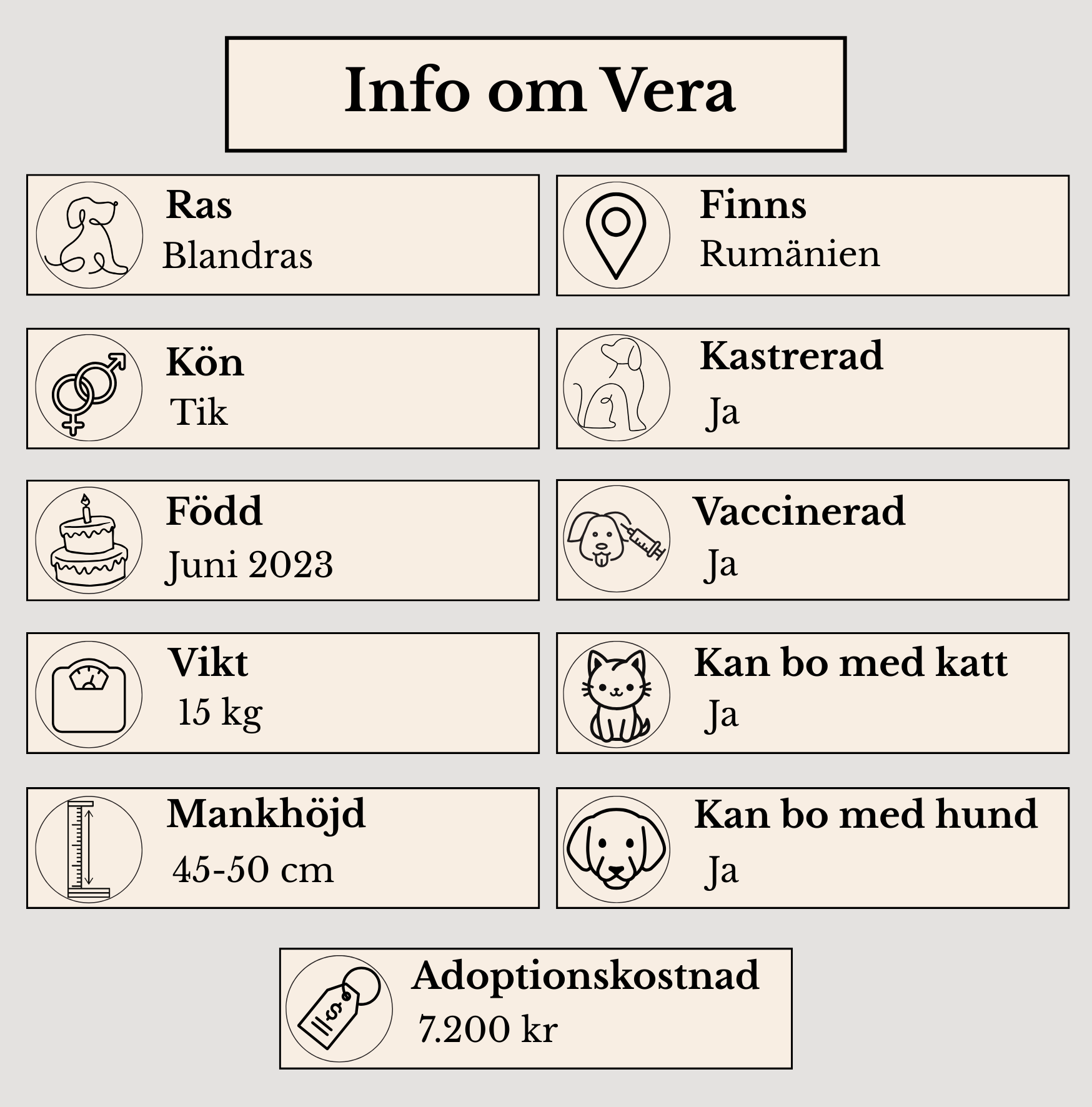 Vera trivs tillsammans med andra hundar, så även katter. Hon är vaccinerad, kastrerad, chippad och har EU-pass.